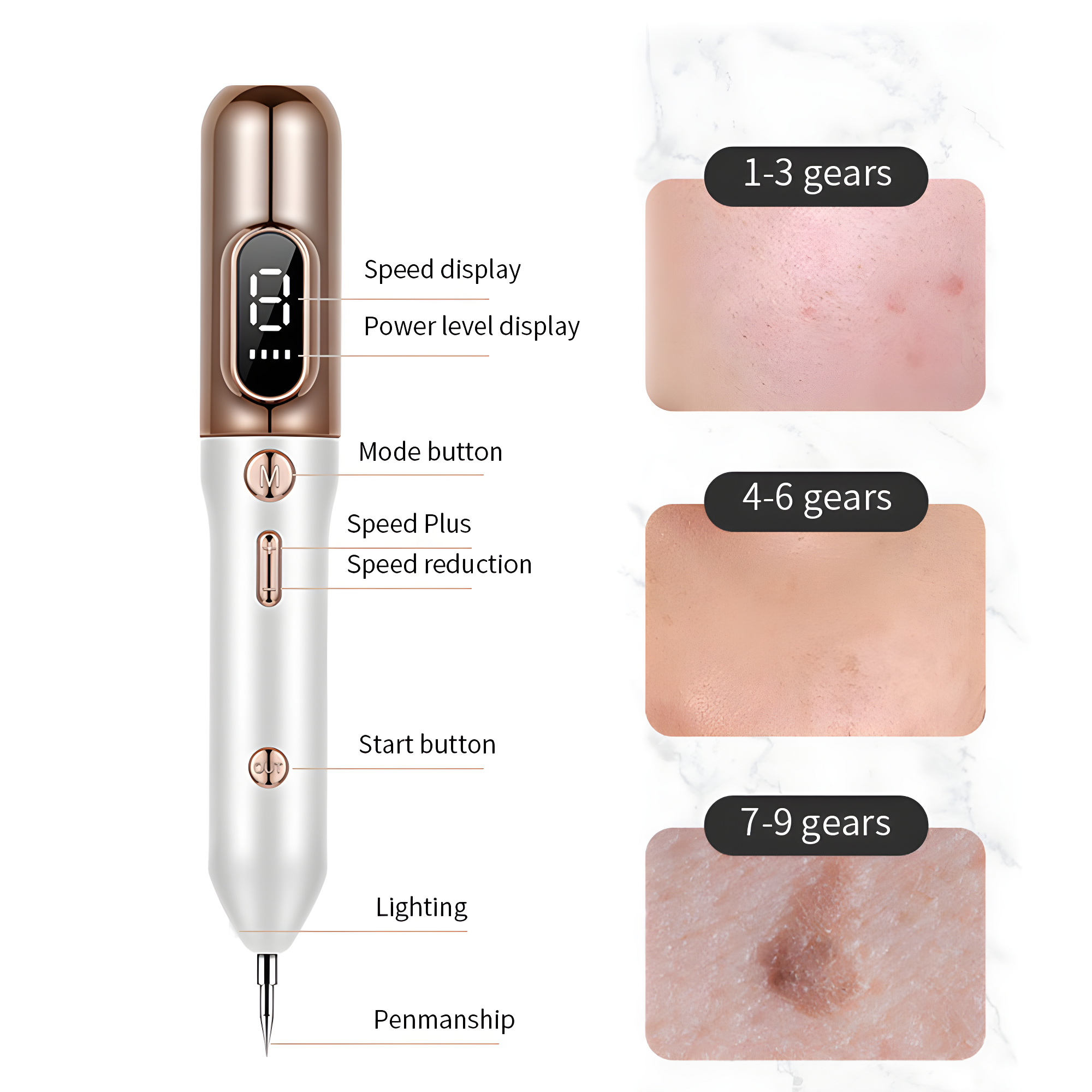 This innovative device utilizes advanced technology to effectively reduce skin imperfections like moles and dark spots. With 9 adjustable power levels, you can select the intensity that best suits your skin's needs, ensuring a personalized treatment experience.